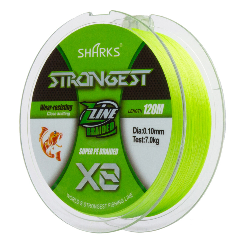 Леска плетеная SHARKS STRONGEST X8 LIGHT GREEN 120м — универсальная бюджетная 8-ми жильная рыболовная плетенка изготовленная из высококачественного микроволокна. Высокопрочная и очень мягкая.
