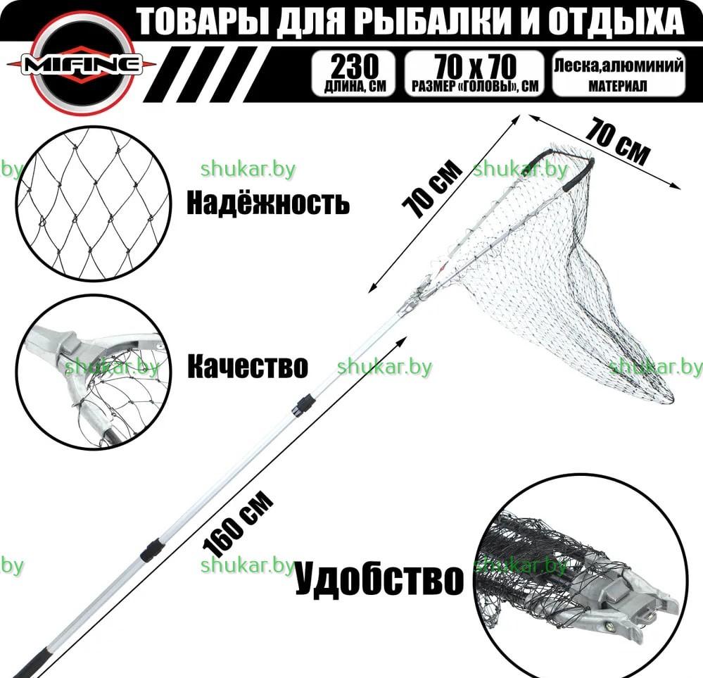 Подсак (подсачек) треугольный Mifine 51003-3 70*70*160 см -легкий и компактный подсак от компании Mifine. Металлический зажим. Ручка телескопическая (160 см.). Усы раздвижные (70 х 70 см.). Сетка выполнена из лески (мононить), легко ополаскивается после рыбалки, что избавляет от неприятного запаха при хранении подсачека. Размер ячеи: 40 мм