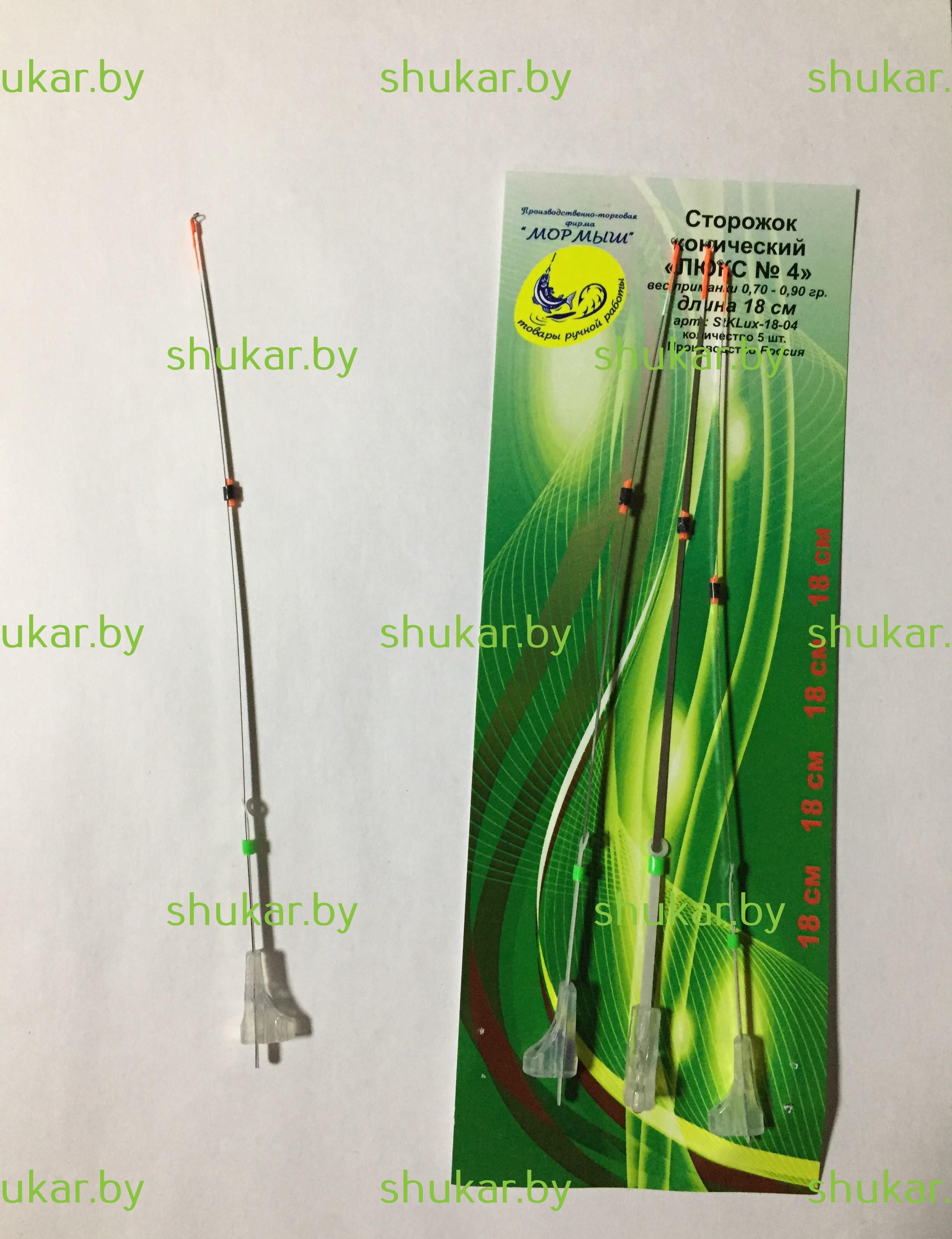 Сторожок конический Люкс №4 18 см 0.7-0.9 гр. выполнен на базе бланка спортивного сторожка серии «Люкс». Отличается новым креплением «Утюжок» из 100% силикона и установкой пропускных колец. Бланк сторожка выполнен из нагартованной нержавеющей калиброванной стали, которая имеет высокую твердость и прочность, при этом сторожок имеет хорошую гибкость и отсутствие остаточной деформации.
